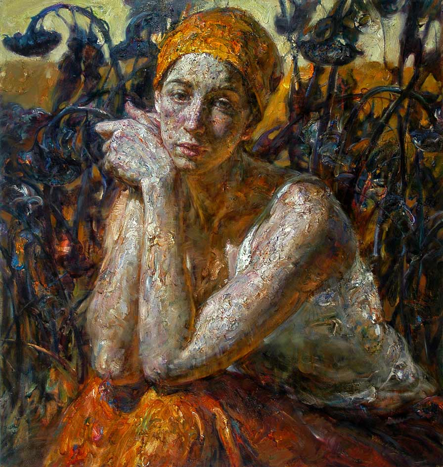 Después de graduarse de la escuela secundaria, me enviaron a un campo de trabajo en el país para "reeducación" durante la Revolución Cultural de China. Allí, fui objeto de trabajo agrícola agotadora. A menudo, he trabajado en los campos de maíz y girasol de sol a sol. Por lo tanto, para mí, girasoles evocan tanto alegría personal y tristeza. Por lo tanto, para entregar mis sentimientos complejos, utilizo girasoles como una metáfora para connotar mis antecedentes y estado emocional. Mi incorporación de collages de figuras de la dinastía Tang de China representa mi herencia china y es un recordatorio constante de dónde vengo. La textura y terrenal en la superficie de la tela se inspiran en la textura de la tierra en la finca donde trabajaba en China. Aunque a menudo me gano un gran placer en el proceso de la pintura, es más importante para desplegar expresivamente esos sentimientos dentro de mí mismo. "Victor Wang